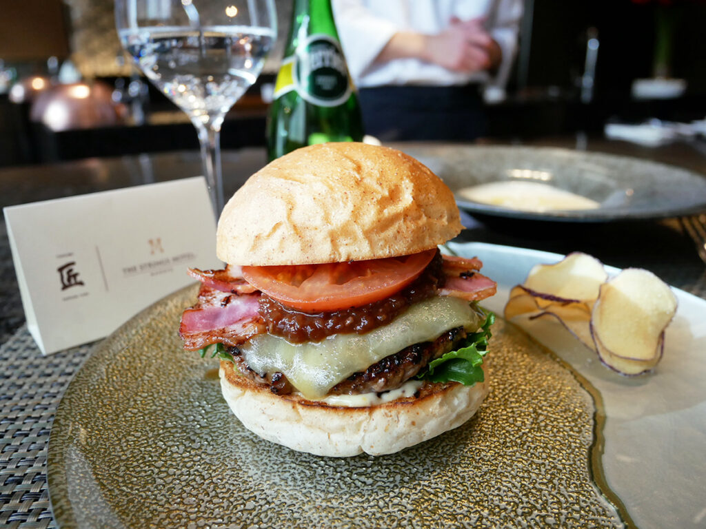 ストリングスホテル 名古屋内のレストラン「鉄板焼 匠」。落ち着いた大人の空間で鉄板焼のライブ感が楽しめます。シェフが目の前で焼き上げる絶品ハンバーガーは平日ランチ限定!肉厚パティと香ばしいバンズ、付け合わせまで含め、ホテルレストランならではのハイクオリティ。ちょっぴり贅沢なランチにおすすめです!