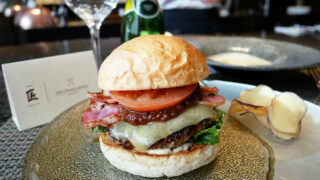 ストリングスホテル 名古屋内のレストラン「鉄板焼 匠」。落ち着いた大人の空間で鉄板焼のライブ感が楽しめます。シェフが目の前で焼き上げる絶品ハンバーガーは平日ランチ限定!肉厚パティと香ばしいバンズ、付け合わせまで含め、ホテルレストランならではのハイクオリティ。ちょっぴり贅沢なランチにおすすめです!